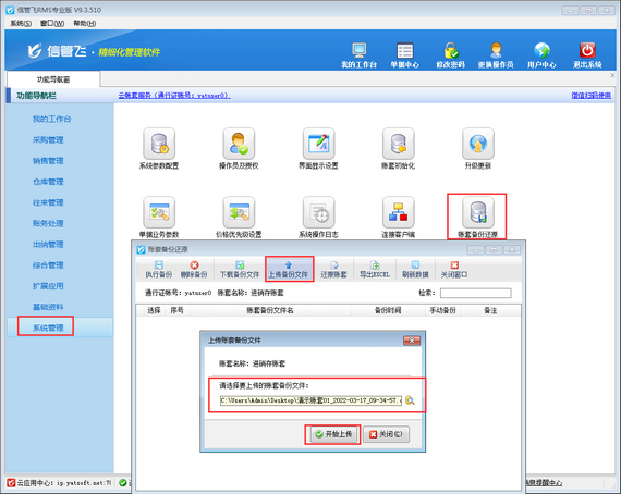新建的賬套登錄后,同樣在功能導航窗中點擊“系統(tǒng)管理”—》“賬套備份還原”,在打開的“賬套備份還原”窗口,上傳備份文件并還原賬套,如下圖所示。