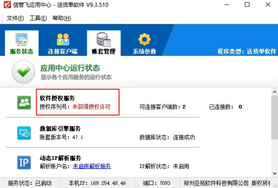 授權(quán)文件形式授權(quán)目前只有信管飛新架構(gòu)軟件支持,如需要變更為授權(quán)形式,需升級到新版本。授權(quán)操作需在紅色應(yīng)用中心程序上操作,操作如下:1、更換前加密鎖設(shè)備需拔出,拔出后應(yīng)用中心程序授權(quán)服務(wù)的授權(quán)序列號會變?yōu)椋何床迦爰用苕i,如下圖: