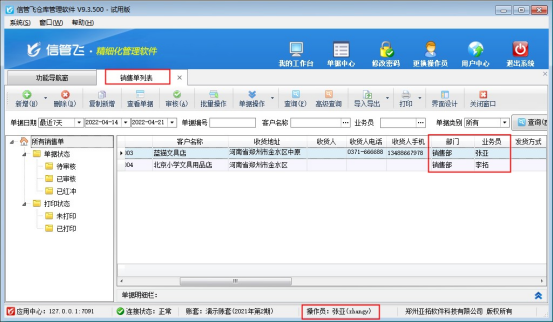 權(quán)限設(shè)置完成后,使用操作員“張亞”登錄軟件查看銷售單列表,可查看到銷售單單據(jù)僅為本部門人員所開(kāi)數(shù)據(jù),切換用“系統(tǒng)管理員”登錄可查看所有單據(jù),如下圖所示: