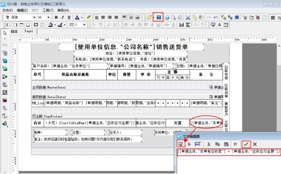 在模板設計器中,新增一個文本框(新增文本框在左側工具欄添加),打開新建文本框然后輸入名稱:欠款,調用數據項“[[單據主體."本單前應收款"] + [單據主體."應收應付金額"]]”,點擊“√”確定保存,如下圖所示: