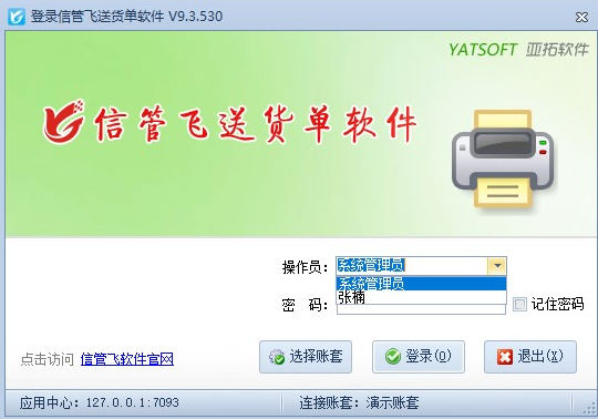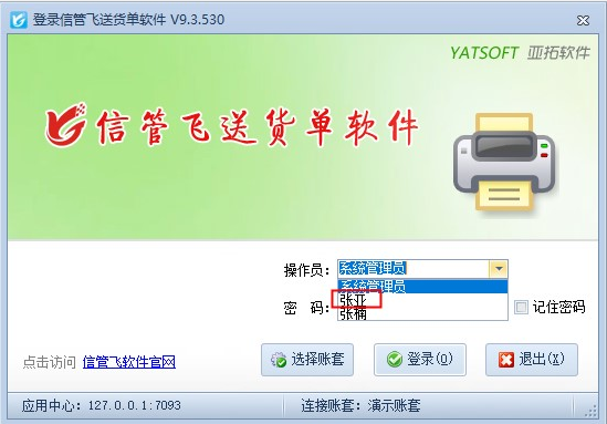 信管飛送貨單軟件在系統管理—操作員及授權中添加操作員及權限添加后,在軟件客戶端程序登錄界面,操作員列表可查看可登錄的所有操作員名字,如下圖所示: