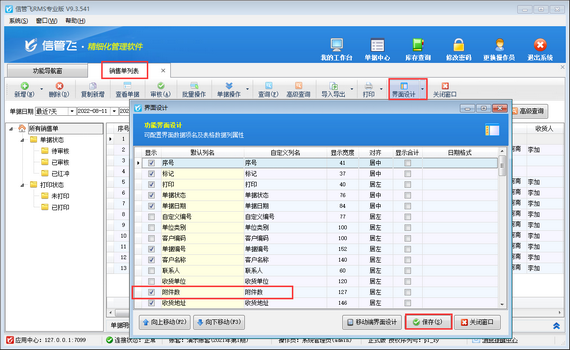 以銷售單列表為例,配置下如何查看銷售單附件數,在銷售單列表工具欄點擊“界面設計”打開界面設計窗口,找到“附件數”數據項,并勾選顯示出來,如下圖所示。