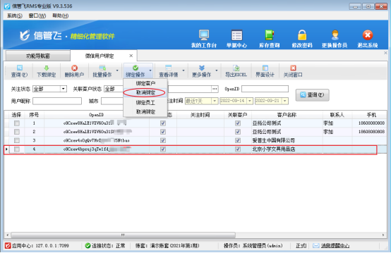 若是綁定有誤或者更換綁定客戶或業務員可進行解除綁定再重新綁定。如何取消綁定?本文以信管飛RMS軟件為例示范如下: