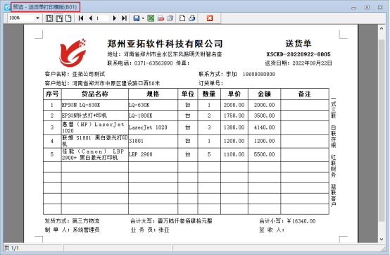 新開送貨單并確認開單,在打印按鈕下選擇“打印預覽”可預覽默認樣式,如下圖所示: