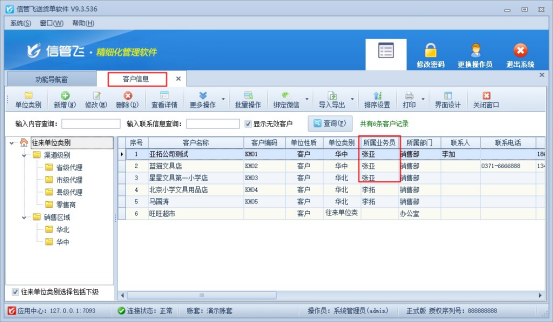 參數(shù)設(shè)置完成后,下一步需要維護(hù)客戶信息的所屬業(yè)務(wù)員,在“基礎(chǔ)資料”中打開(kāi)“客戶信息”修改客戶選擇所屬業(yè)務(wù)員,示范業(yè)務(wù)員“張亞”,如下圖所示: