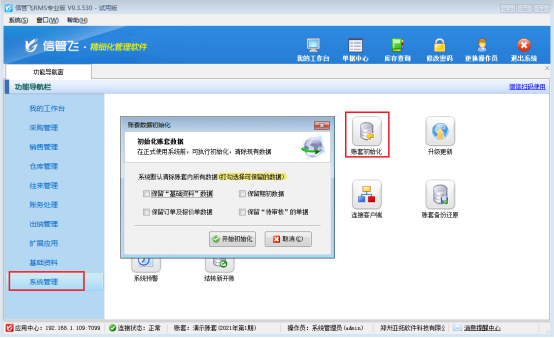 默認初始化會刪除所有的數據(包括基礎資料和業務單據),我們可以根據自己的實際需要去選擇需要保留和刪除的內容,可打勾選擇要保留的數據內容。點“開始初始化”等待軟件執行完成即可,如下圖所示: