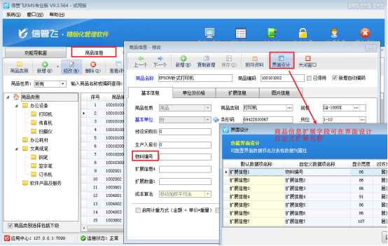 首先需要在基礎資料—》商品信息中維護好商品的物料編號,示例商品“EPSON針式打印機”物料編號維護在“擴展信息1”中(擴展信息的顯示名稱可以在界面設計中自定義修改),如下圖所示: