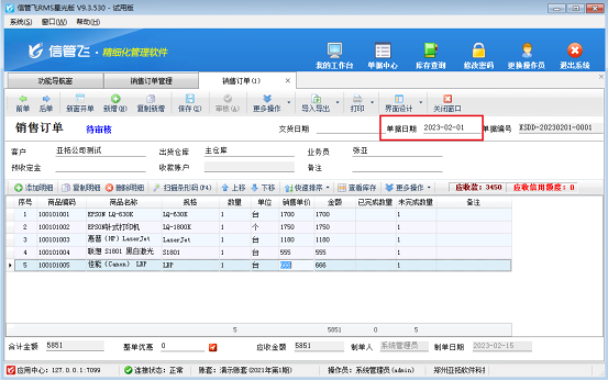 第二步:先開一個訂單,訂單的日期內容為“2023年2月1日”,保存并審核訂單,訂單內容如下圖所示: