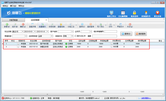 收款結(jié)算單單據(jù)審核之后,會更新銷售應(yīng)收款及客戶預(yù)付款的結(jié)銷狀態(tài),在應(yīng)收款管理界面可以查看結(jié)銷情況,如下圖所示,剛新增的銷售應(yīng)收款記錄已更新為“已結(jié)銷”,未結(jié)銷金額為0;剛新增的客戶預(yù)付款記錄更新為“部分結(jié)銷”狀態(tài),未結(jié)銷金額還有-2400元,后續(xù)還可以用于沖銷銷售應(yīng)收款。