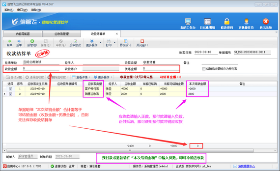 在應(yīng)收款管理界面工具欄點擊“收款結(jié)算”按鈕,可以打開收款結(jié)算單對客戶預(yù)付款/銷售應(yīng)收款進行收款結(jié)銷。如下圖所示,客戶“亞拓公司測試”應(yīng)收金額2600元,客戶預(yù)付款5000元,在單據(jù)明細“本次結(jié)銷金額”中,銷售應(yīng)收款輸入2600,客戶預(yù)付款輸入-2600,正負抵消,即可使用客戶預(yù)付款沖銷銷售應(yīng)收款。