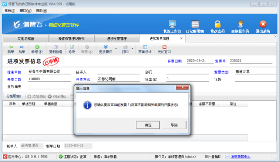信管飛出納記賬軟件中支持反審發(fā)票,發(fā)票已審核后如發(fā)現(xiàn)填寫錯誤,可以反審修改發(fā)票,反審后,發(fā)票狀態(tài)恢復(fù)為未審核狀態(tài),可以繼續(xù)對該發(fā)票進(jìn)行修改操作,如下圖所示。