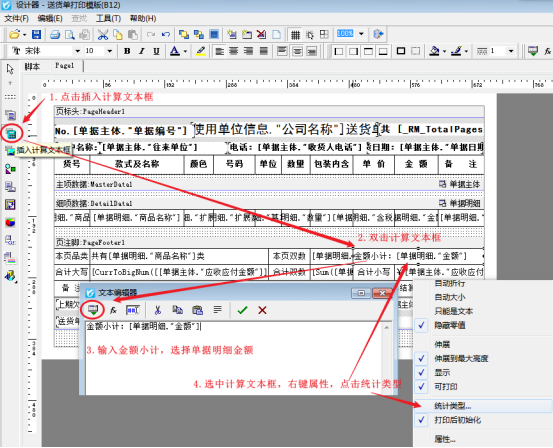 需要金額小計在每一頁顯示,在模板設計器界面,點擊左側工具欄的第一項,選擇“插入計算文本框”,添加到合適位置處,雙擊文本框,輸入文字“金額小計:”,點擊插入數據字段,選擇數據項“單據明細·金額”,選中計算文本框右鍵點擊“統計類型”如下圖所示: