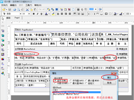 在屬性界面統計類型選擇“合計”后,統計選擇“DetailDatal”,然后點擊確定如下圖所示: