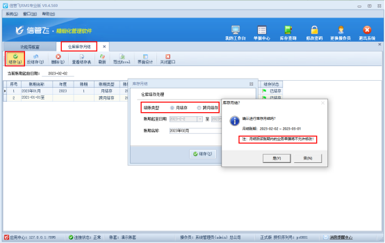 信管飛RMS軟件、信管飛倉庫管理軟件最新版增加庫存月結功能,可按月或跨月進行庫存結存,結存后可直接調整庫存數量及庫存成本。本文以信管飛RMS專業版為例示范下如果操作。