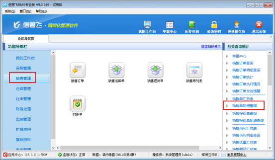 信管飛RMS軟件、信管飛倉庫管理軟件、信管飛送貨單軟件等都支持開銷售單,已開單據支持匯總統計。軟件根據錄入的單據,可以自動生成統計報表,后期查詢對賬可做到一目了然。針對客戶咨詢如何導出某客戶一段時間的所有銷售商品明細,本文示范下不同軟件在哪進行查詢匯總?