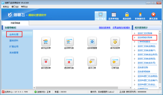 信管飛送貨單軟件,功能導航窗點擊“業務處理”,右側查詢統計下點擊“送貨明細對賬單”,可匯總客戶已開送貨單的商品明細內容,如下圖所示:
