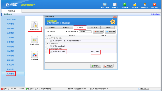 功能導航窗點擊“系統管理”-》“系統參數配置”-》“業務參數”打開業務參數配置界面,數據可否重復參數下取消勾選參數“商品信息不可重復”,勾選之后點擊保存,如圖所示: