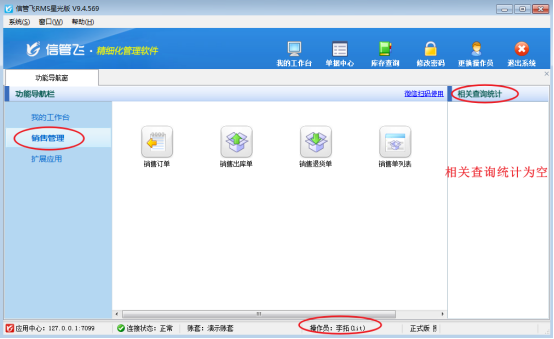 以操作員“李拓”為例,未設置操作員銷售管理相關查詢權限時,操作員賬號登錄,銷售管理右側(cè)相關查詢?yōu)榭瞻祝疚囊?A title="" href="http://www.uzaiuzai.com/erp/index.html">信管飛RMS軟件為例演示一下操作員賬號無法查看銷售管理相關查詢,如何解決?如圖所示: