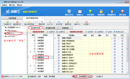 設置操作員權限:選中操作員“李拓”賬號,然后在功能模塊權限中勾選設置操作員銷售查詢功能(右側(cè)默認全部勾選,不需要的權限可取消勾選),點擊保存即可,如圖所示: