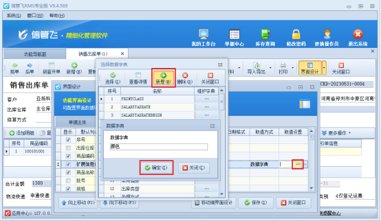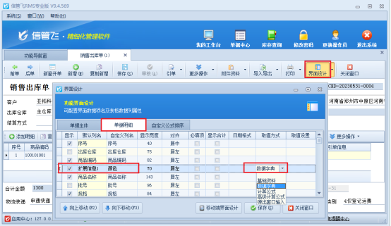 在功能導航欄點擊銷售管理---打開銷售出庫單,在開單界面點擊界面設計,勾選擴展信息并自定義列名為“顏色”,取值方式選擇“數據字典”,如圖所示: