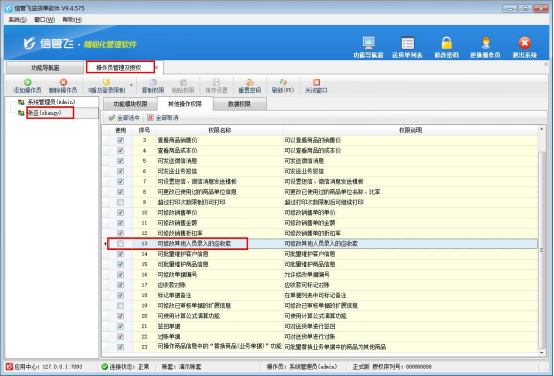在功能導航窗點擊“系統管理”—“操作員及授權”,在操作員及授權界面,選擇操作員“張亞”,打開其他操作權限,取消勾選權限“可修改其他人員錄入的應收款”,然后保存設置,如下圖所示: