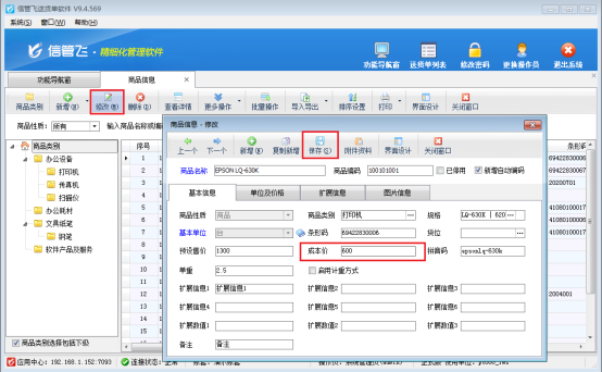 在功能導航窗點擊“基礎資料”—》“商品信息”打開商品信息界面,以商品“EPSON LQ-630K”為例,選擇商品后點擊“修改”按鈕,錄入成本價為600元,再保存商品信息,如圖所示。
