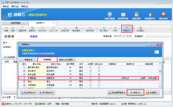 維護商品成本價之后,在功能導航窗點擊“業(yè)務處理”—》“新開送貨單”—》“界面設計”,單據(jù)明細項勾選擴展數(shù)值(自定義列名銷售毛利),取值方式選擇“計算公式”,取值設置:金額-成本金額,設置完成后點擊保存,如圖所示。