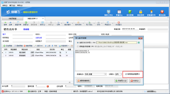 如導入盤點機數據時,勾選了“相同商品數量累計”,則導入相同商品時,數量會自動累計,如下圖所示。