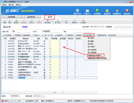 商品選擇完成后,在明細工具欄盤點操作下選擇“批量更新盤點數量為0”,可直接批量設置商品盤點數量顯示0,如下圖所示: