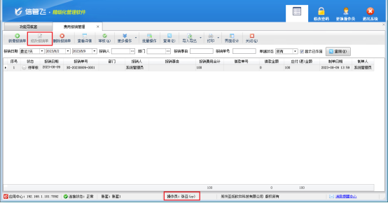 權限設置完成后,使用操作員“張亞”登錄軟件,打開費用報銷管理界面,可以看到工具欄“修改”按鈕為灰色的,操作員無法修改費用報銷單。如圖所示: