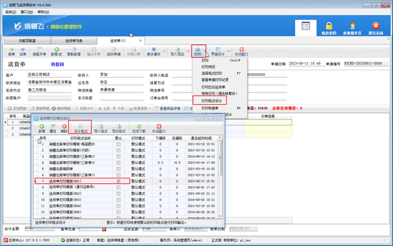 以送貨單軟件為例,打開(kāi)一個(gè)送貨單,在單據(jù)界面工具欄點(diǎn)擊“打印”—》“打印格式設(shè)計(jì)”,在打開(kāi)的打印格式設(shè)計(jì)窗口選擇需要調(diào)整的打印格式模板,然后點(diǎn)擊“設(shè)計(jì)格式”進(jìn)入模板設(shè)計(jì)器,如下圖所示。