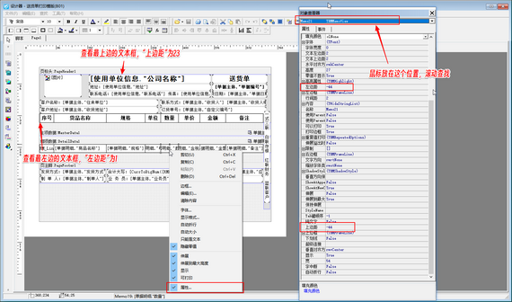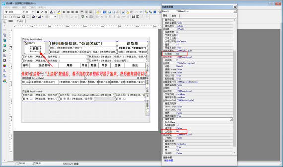 然后修改查找到的文本框“上邊距”及“左邊距”數(shù)值,修改“上邊距”數(shù)值大于最上邊的文本框“上邊距”數(shù)值,修改“左邊距”數(shù)值大于最左邊的文本框“左邊距”數(shù)值,修改完成后,此數(shù)據(jù)項(xiàng)在打印模板設(shè)計(jì)器內(nèi)即可顯示出來(lái),然后刪除此文本框就可以,如下圖所示。