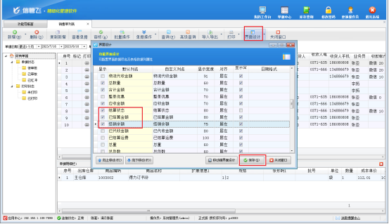 參數(shù)配置完成后,打開“銷售管理”—》“銷售單列表”界面,界面設(shè)計中把數(shù)據(jù)項(xiàng)“已結(jié)算金額、結(jié)算余額、結(jié)算狀態(tài)”勾選顯示,保存界面設(shè)計,如下圖所示: