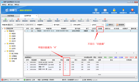 最近有用戶在使用送貨單軟件時(shí),反饋存在以下問題,在填開送貨單時(shí),有錄入商品數(shù)量,但是在送貨單列表不顯示送貨單“總數(shù)量”數(shù)據(jù),如下圖所示。