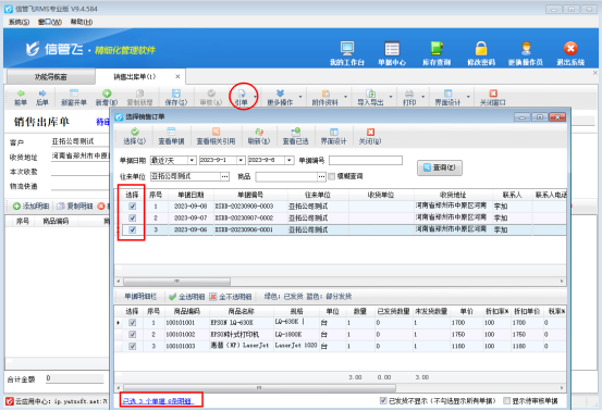 信管飛軟件批量引用訂單功能,支持同一個客戶的多筆訂單可同時選擇開單,在銷售出庫單界面,選擇客戶后點擊引單按鈕,引用銷售訂單。在銷售訂單選擇界面,顯示該客戶所有未引用的銷售訂單記錄。支持多選操作,如下圖所示: