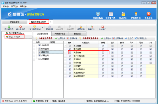 本文以“信管飛送貨單軟件”為例進行示范,在功能導航窗點擊“系統(tǒng)管理”—“操作員及授權(quán)”,設(shè)置操作員“張亞”基礎(chǔ)資料商品信息取消新增權(quán)限,如下圖所示: