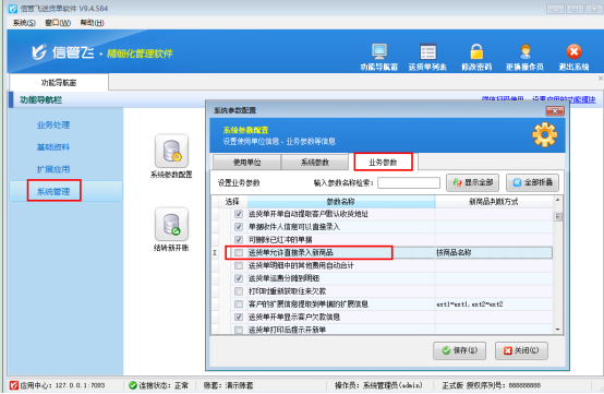 權(quán)限設(shè)置后保存設(shè)置,在“系統(tǒng)管理”—系統(tǒng)參數(shù)配置中“業(yè)務參數(shù)”,取消勾選參數(shù)“送貨單允許直接錄入新商品”并保存參數(shù),如下圖所示: