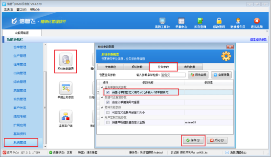 在功能導(dǎo)航窗點(diǎn)擊“系統(tǒng)管理”—》“系統(tǒng)參數(shù)配置”—》“業(yè)務(wù)參數(shù)”,業(yè)務(wù)單據(jù)相關(guān)參數(shù)下勾選“銷售訂單的自定義編號不允許輸入(取單據(jù)編號)”,之后點(diǎn)擊保存,如圖所示: