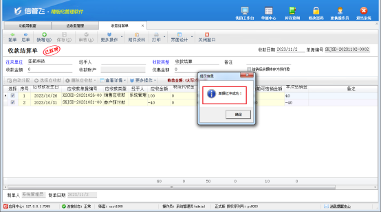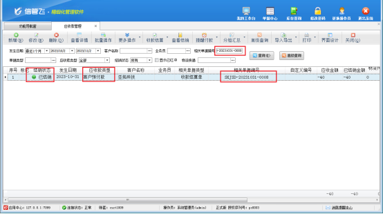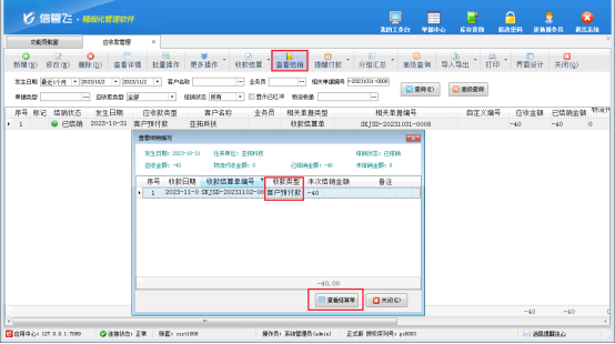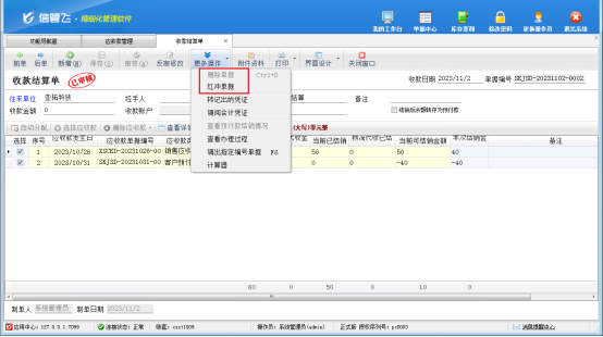 然后,選中此已結(jié)銷的客戶預(yù)付款記錄,在工具欄點(diǎn)擊“查看結(jié)銷”—》“查看結(jié)算單”,打開此客戶預(yù)付款的結(jié)銷記錄,更多操作下將此客戶預(yù)付款結(jié)銷記錄先紅沖后刪除,此時(shí)單據(jù)編號(hào)為“SKJSD-20231031-0008”的收款結(jié)算單即可反審修改成功,如下圖所示。