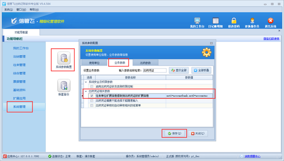 在功能導(dǎo)航窗點(diǎn)擊“系統(tǒng)管理”—》“系統(tǒng)參數(shù)配置”—》“業(yè)務(wù)參數(shù)”打開業(yè)務(wù)參數(shù)配置界面,然后在出納憑證相關(guān)參數(shù)中打鉤啟用“往來單位擴(kuò)展信息提取到出納憑證的擴(kuò)展信息”參數(shù),參數(shù)值輸入相應(yīng)提取的數(shù)據(jù)項(xiàng)名稱,如提取往來單位的開戶銀行和銀行賬號信息到出納憑證的擴(kuò)展信息1和擴(kuò)展信息2內(nèi)顯示,則需要輸入“ext1=accountbank,ext2=accountno”,用英文的逗號間隔,然后點(diǎn)擊“保存”按鈕保存參數(shù)配置,如下圖所示。