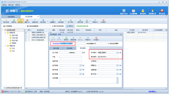 設(shè)置完成后,在功能導(dǎo)航窗點(diǎn)擊“基礎(chǔ)資料”—》“供應(yīng)商信息”打開供應(yīng)商管理界面,選擇一個(gè)供應(yīng)商,修改供應(yīng)商開戶銀行和銀行賬號信息,如下圖所示。