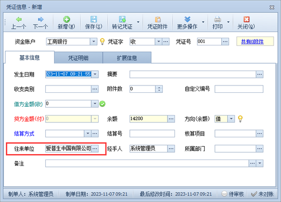出納記賬軟件在登記出納憑證時(shí),支持將往來單位擴(kuò)展信息提取到憑證的擴(kuò)展信息內(nèi)顯示,有用戶需要提取往來單位的開戶銀行和銀行賬號信息到出納憑證內(nèi)顯示,本篇文章介紹一下操作方法。