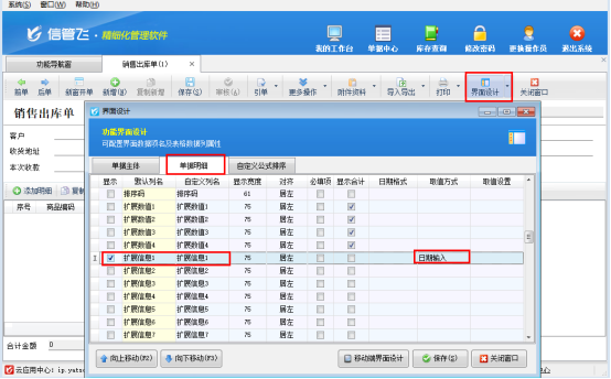功能導(dǎo)航窗選擇“銷售管理”,打開銷售出庫單界面,點(diǎn)擊工具欄“界面設(shè)計(jì)”,界面設(shè)計(jì)單據(jù)明細(xì)中勾選顯示“擴(kuò)展信息1”,取值方式選擇“日期輸入”,保存界面設(shè)計(jì)。如下圖所示: