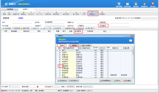 在功能導(dǎo)航窗點擊“業(yè)務(wù)處理”——》“新開送貨單”,打開送貨單開單界面,在界面設(shè)計中將“單據(jù)主體”及“單據(jù)明細(xì)”中“其他費用”字段配置顯示出來,如圖所示。