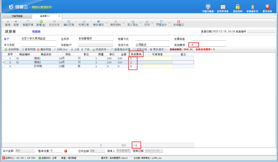 設(shè)置好之后,開送貨單時在單據(jù)明細(xì)“其他費用”中錄入相關(guān)金額,錄入完成后就可以看到單據(jù)主體其他費用中已經(jīng)顯示出明細(xì)中的其他費用合計。