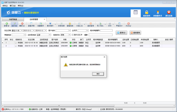 信管飛送貨單軟件支持設置多個操作員并對操作員賬號設置操作權限,有用戶登錄軟件無法修改應收款信息,系統彈出提示“當前記錄為其它操作員錄入的,您沒有權限修改!”,如下圖所示。