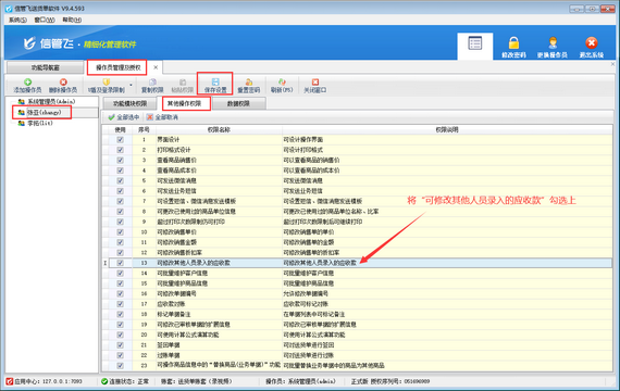 解決方法如下:使用系統管理員賬號登錄軟件,在功能導航窗點擊“系統管理”—》“操作員及授權”打開操作員管理及授權界面,選擇操作員賬號,在“其他操作權限”界面將“可修改其他人員錄入的應收款”權限勾選上,然后保存權限設置,如下圖所示: