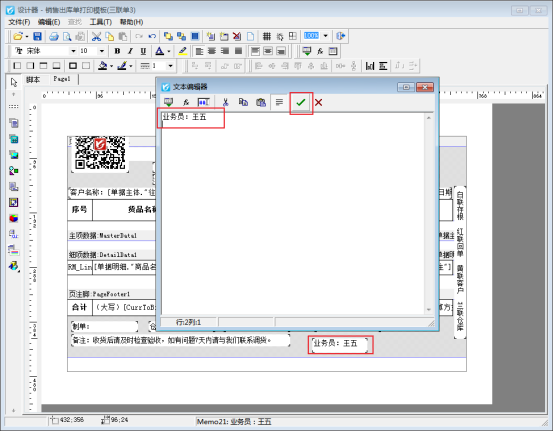 第一種情況:業(yè)務(wù)員名字固定顯示,雙擊打開添加的文本框,直接輸入內(nèi)容,示例內(nèi)容“業(yè)務(wù)員:王五”,之后點(diǎn)擊“√”確定,添加完成后預(yù)覽模板如下圖所示: