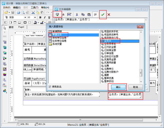 第二種情況:業(yè)務(wù)員名字調(diào)用開單界面單據(jù)主體的業(yè)務(wù)員,雙擊打開添加的文本框,先輸入內(nèi)容“業(yè)務(wù)員:”,之后調(diào)用“[單據(jù)主體."業(yè)務(wù)員"]”,點(diǎn)擊“√”確定,設(shè)置完成后,預(yù)覽界面如下圖所示: