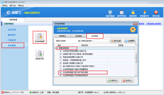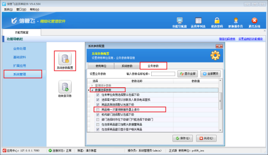 在功能導航窗點擊“系統管理”—》“系統參數配置”—》“業務參數”,即可進入到“業務參數”配置界面,在數據選擇參數內取消勾選“商品每一次查詢到服務器上進行”參數,然后點擊“保存”按鈕保存設置,如下圖2所示: